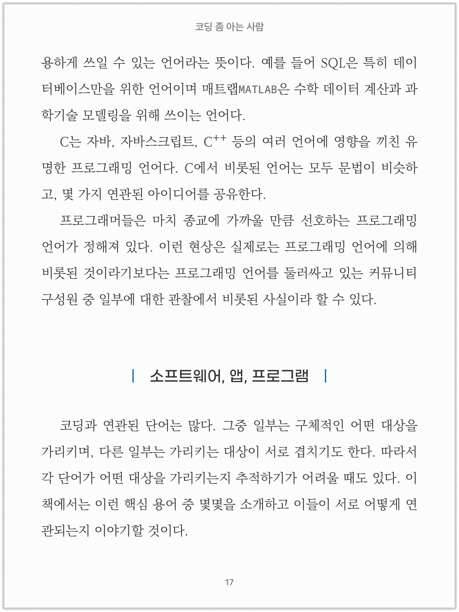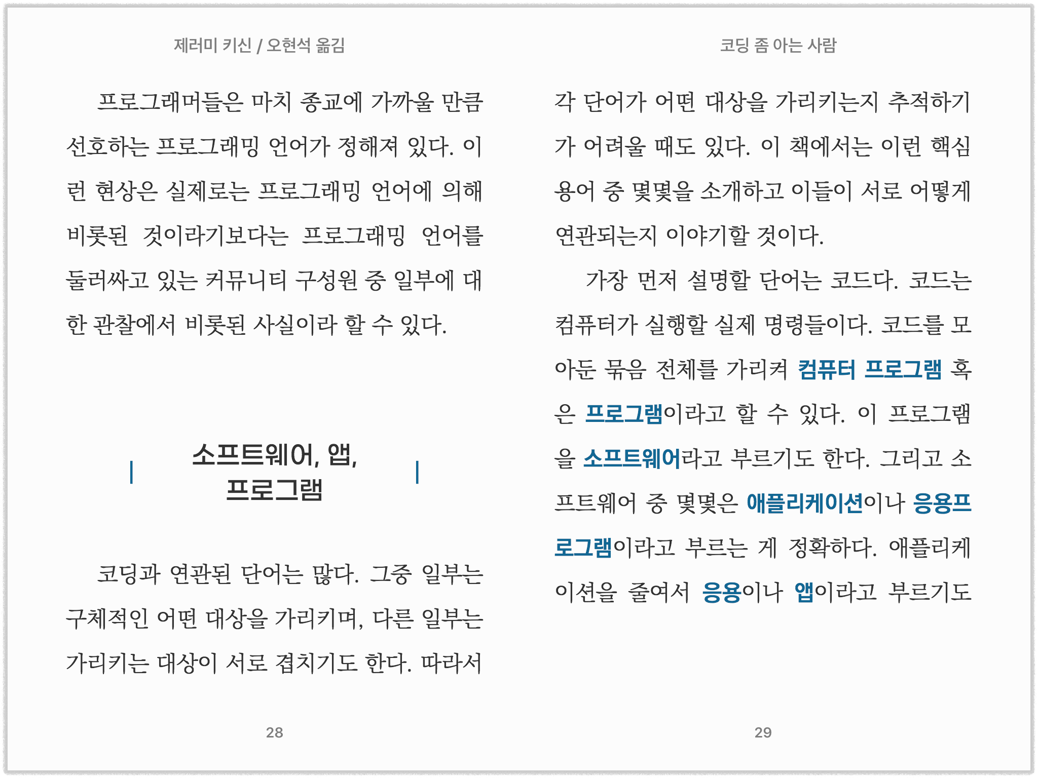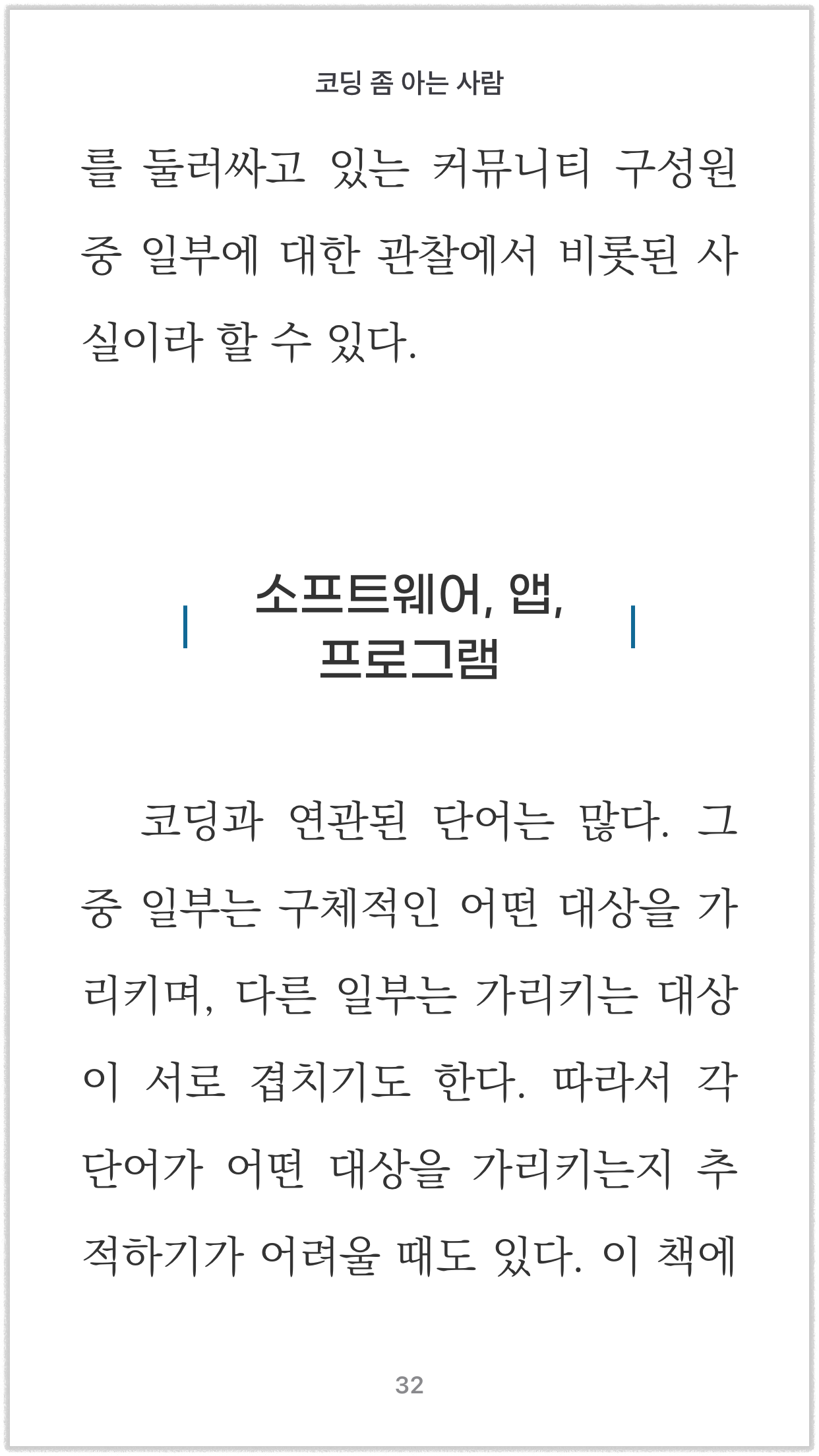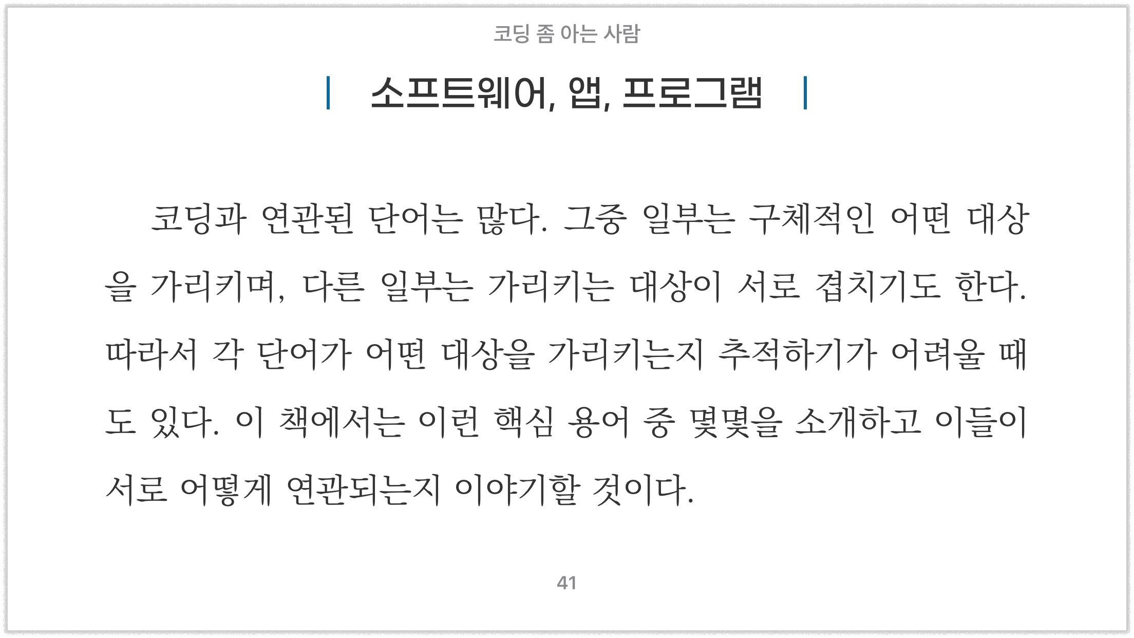 위의 예에서 중제목인 '소프트웨어, 앱, 프로그램'을 보면 텍스트가 화면 너비의 제약으로 인해 두 줄로 표시돼야 할 경우 변화하는 모습을 확인할 수 있습니다. 양쪽 세로 바(|)를 기준으로 텍스트만 중앙에서 두 줄로 바뀌는 것을 볼 수 있는데 이는 원래 이렇게 변화하는 것이 아니라, 이런 상황이 됐을 때 이런 방식으로 출력되도록 설정했기 때문입니다. 이처럼 상황을 다르게 적용해 보면 전자책이 어떤 방식으로 환경에 적응하도록 제작되었는지도 확인할 수 있습니다.