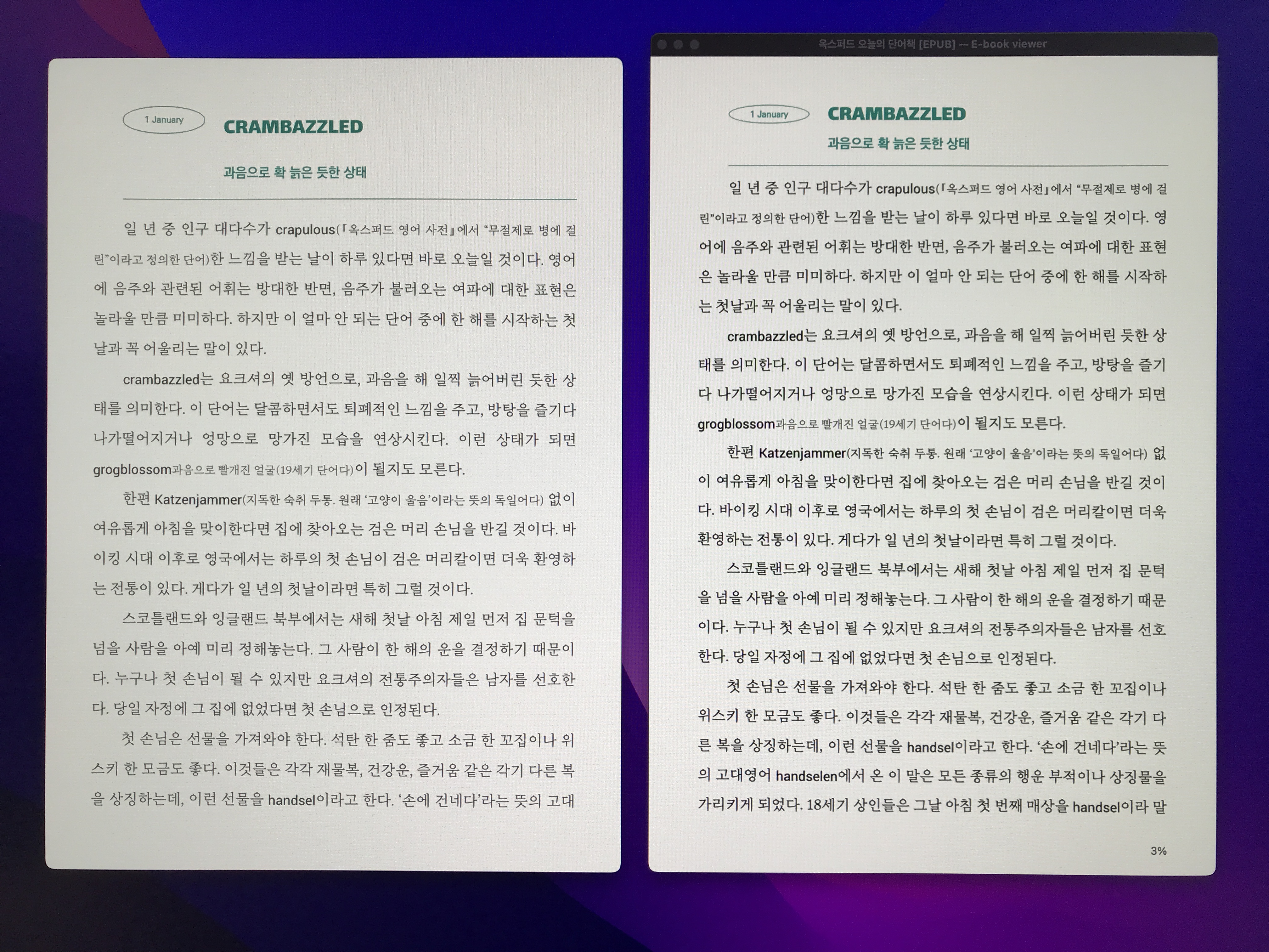 화면 해상도가 뛰어날수록 전자책을 실제 책처럼(혹은 실제 책보다) 더 선명하게 보여줍니다. 위 사진은 해상도가 다른 시스템에서 캘리버 뷰어를 사용해 글자 크기와 창 크기를 비슷하게 설정해놓고 찍은 사진입니다. 해상도가 뛰어날수록 글자를 더 선명하게 보여준다는 사실을 확인할 수 있습니다.