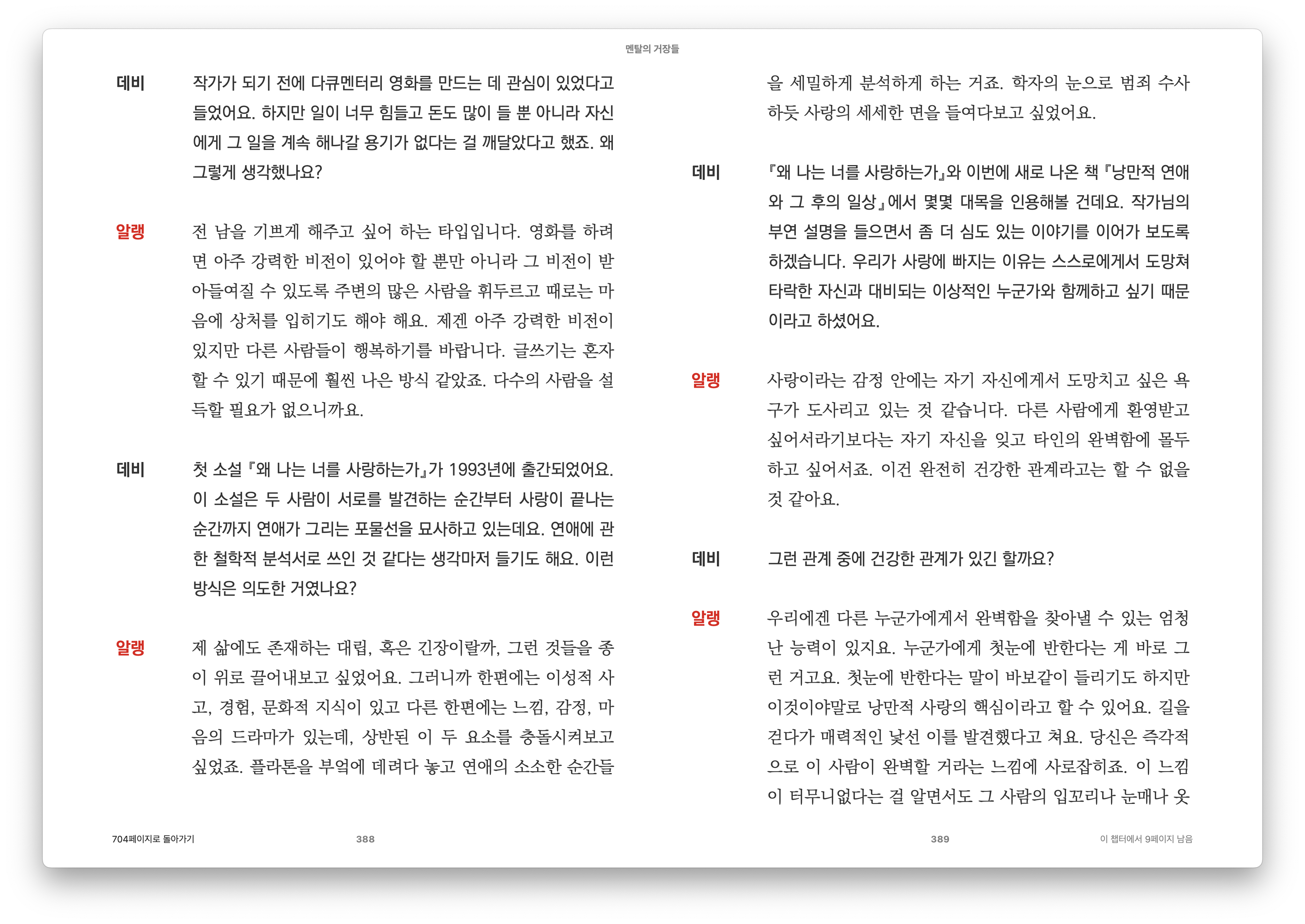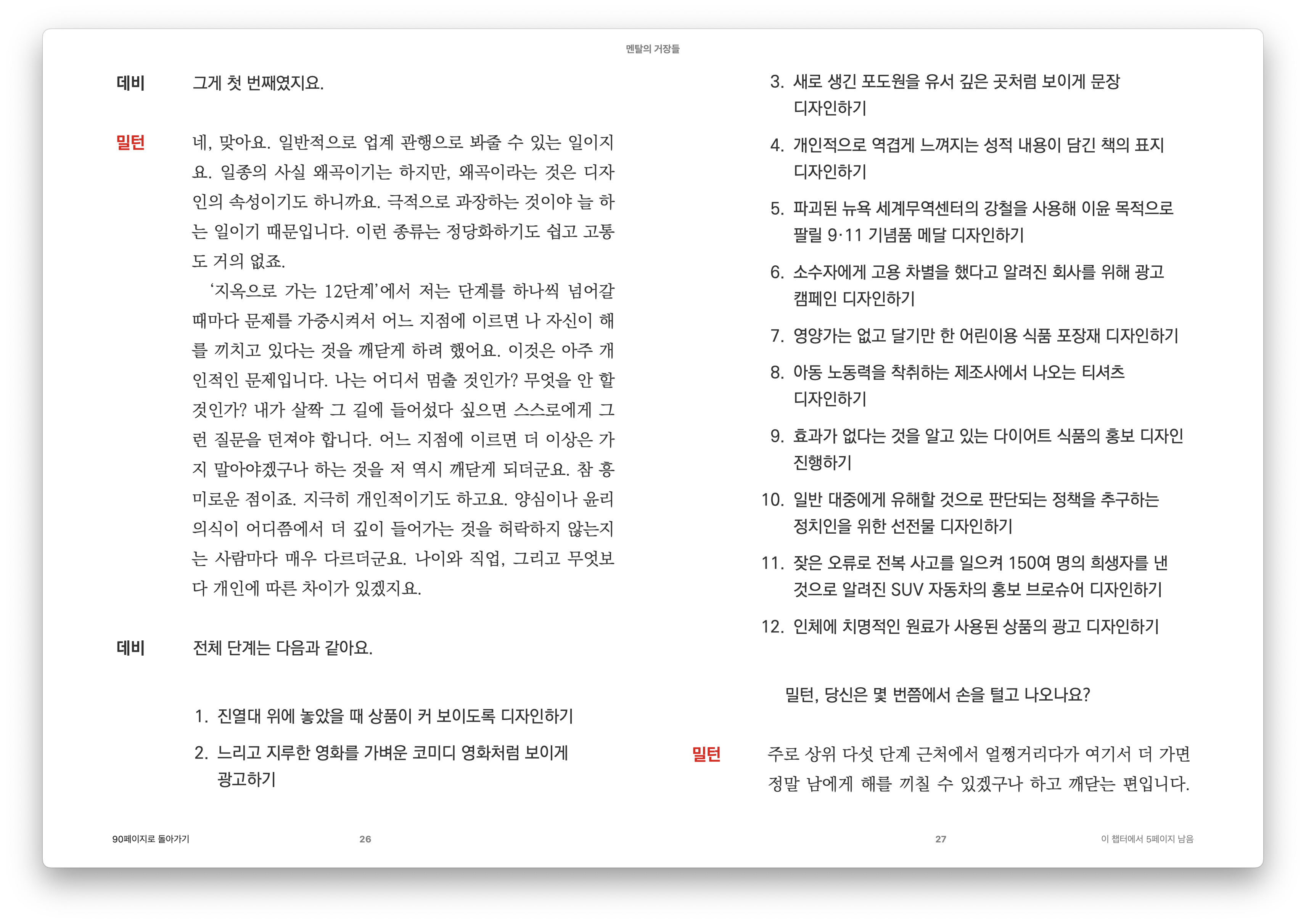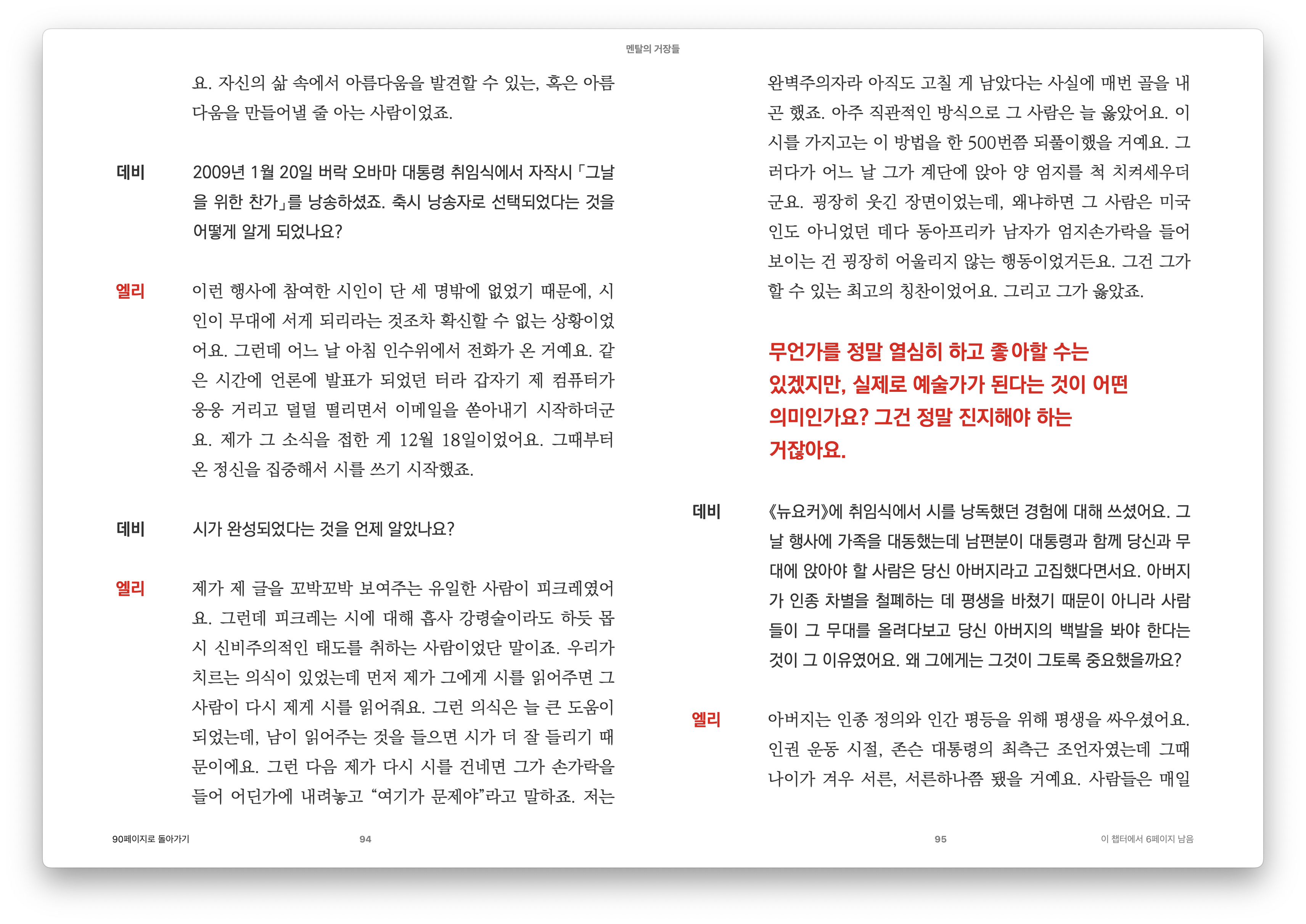 중간중간에 인터뷰 상대의 말 중 핵심적인 내용을 굵고 큰 적색 글씨로 강조한 부분이 나온다. 전자책은 가변 판형이기 때문에 이런 부분에 꽤 신경을 쓰는 편이다. 종이책과 동일하게 문장을 끊으면 조건이 달라졌을 때 의도하지 않은 결과를 얻을 수 있다. 문장을 끊지 않되 단어가 분리되지 않도록 편집했다. 문단의 우측에도 약간의 여백을 줬다. 내가 제목 등에 주로 사용하는 기법이다.