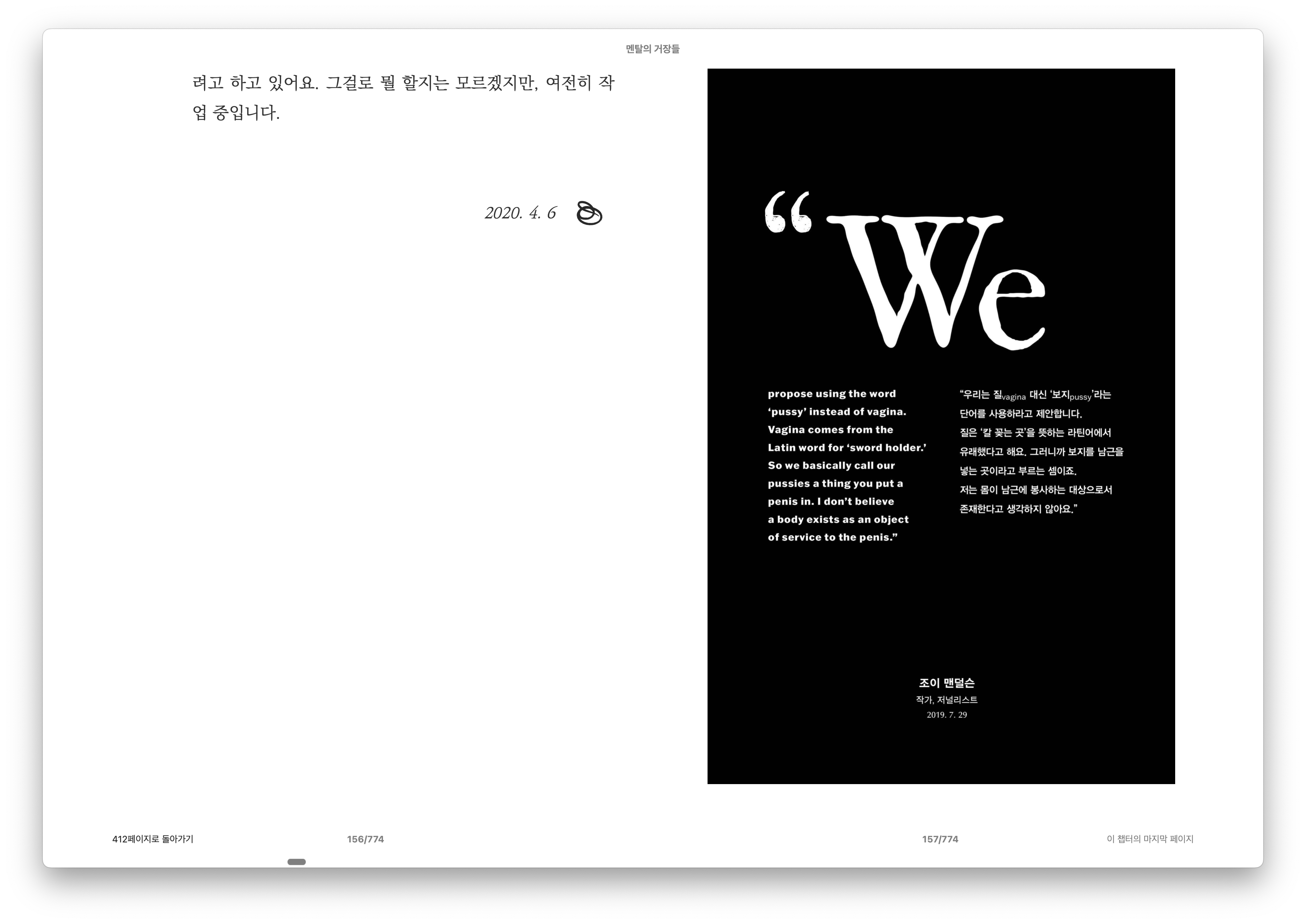 나중에 실물 종이책을 영접했는데 꽤 두꺼웠다. 작업한 책이 이렇게 두꺼운 책이었다니... 어쩐지 시간이 꽤 오래 걸렸다. 작업 전에 미리 봤다면 시작도 하기 전에 기가 좀 죽었을지도 모르겠다. 예전에 읽은 '오베라는 남자'가 생각났다. 전자책으로 봤고 꽤 재미있어서 읽는 데 그리 오랜 시간이 걸리지 않았는데 나중에 종이책을 보니 꽤 두꺼운 책이어서 놀랐다. 이것도 전자책의 장점 중 하나일 수도 있겠다는 생각이 들었다. 책 두께로 독자의 기를 죽이지 않는 것 말이다.