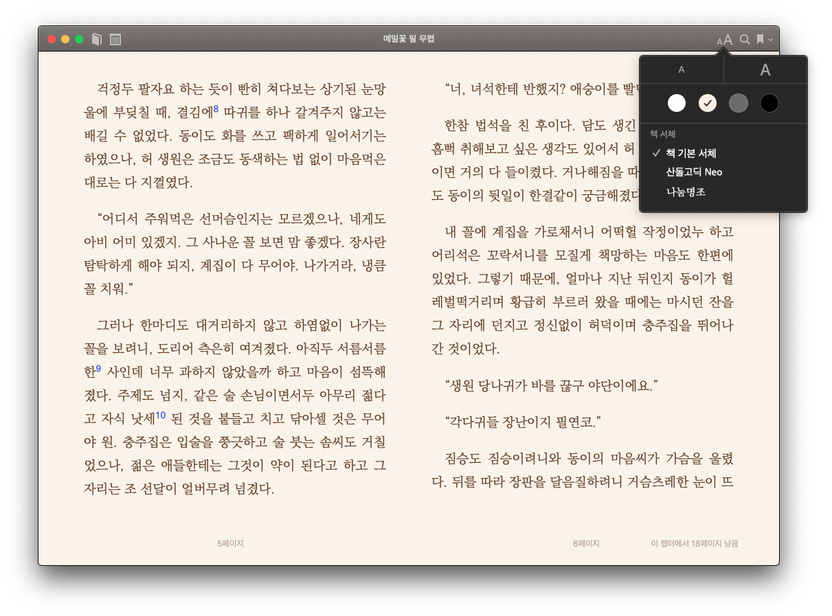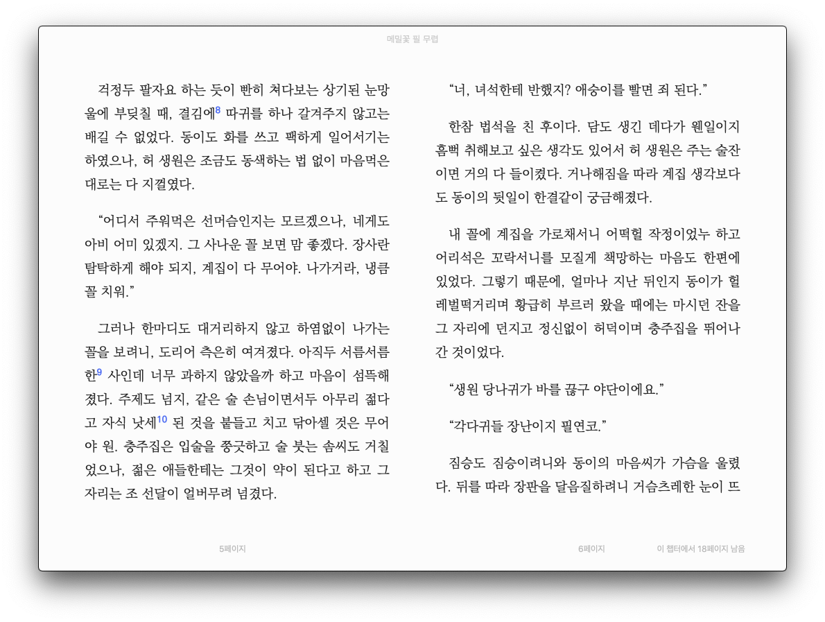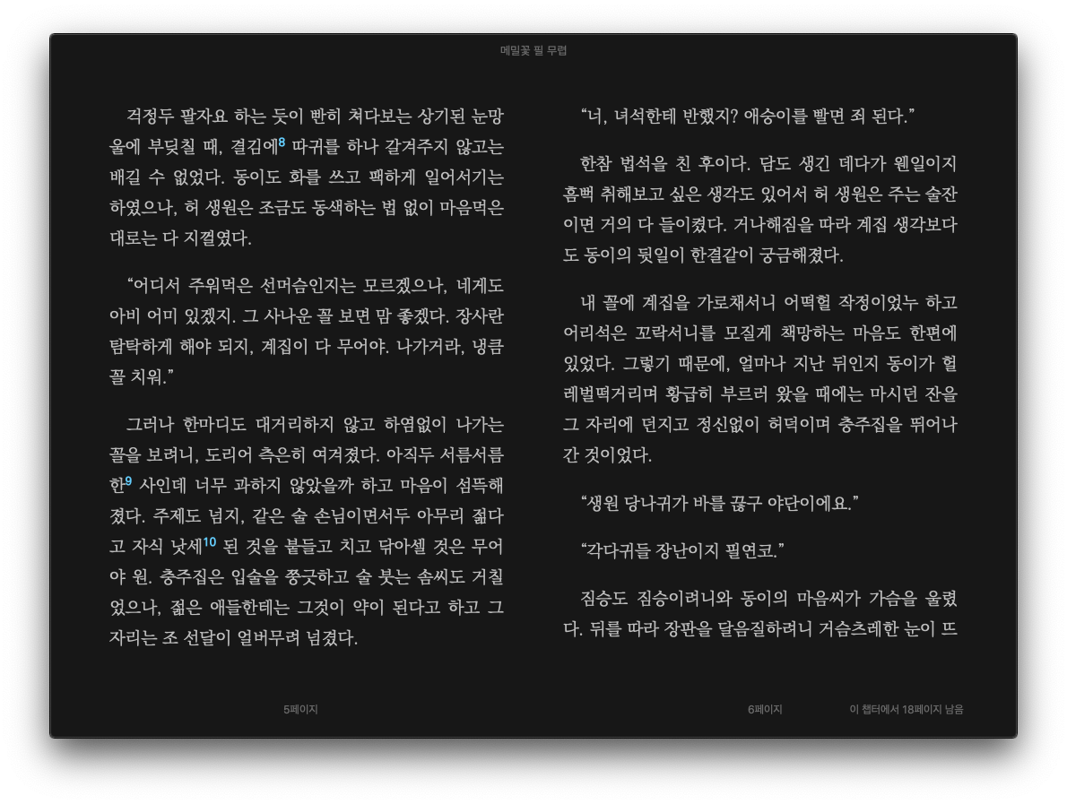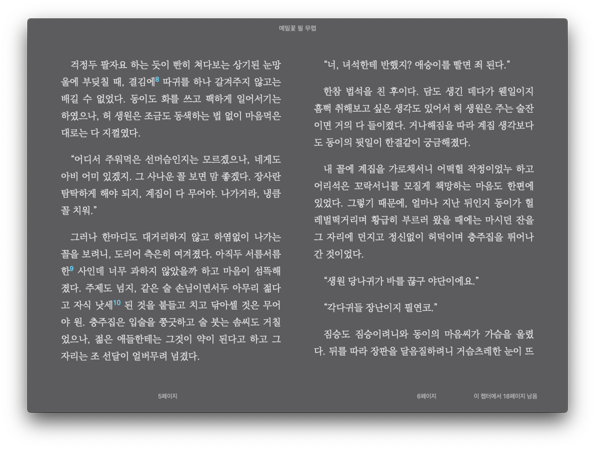 게다가, 앱(App)에 따라 조금씩 다르게 보이기도 한다. 같은 전자책 파일이라도 사용하는 앱이나 단말기에 따라 다르게 보일 수 있다. 전자책 파일 내의 이미지는 컬러이지만 흑백 디스플레이를 가진 단말기에서는 흑백 이미지로 보이는 것처럼, 전자책 파일 내에 지정되어 있는 설정이 앱의 성능에 따라 지원되기도, 지원되지 않기도 한다. 이에 대해서는 나중에 한번 다뤄보려고 한다.