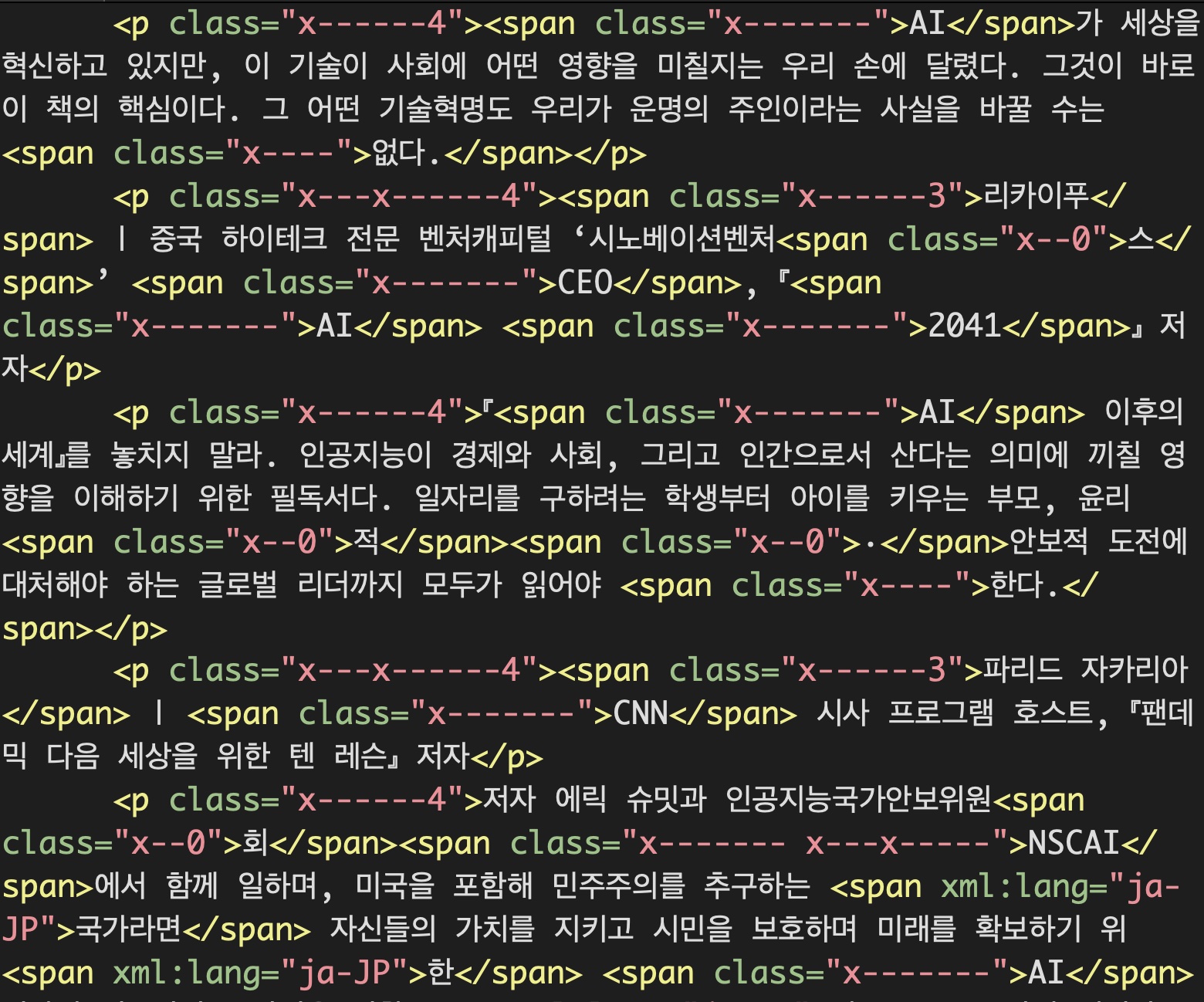 원래는 특정 문단이나 단어에 스타일을 지정하는 작업입니다만 실상은 불필요하게 지정된 스타일을 제거하는 작업이라고 할 수 있습니다. 인디자인 파일에서 '내보내기'를 통해 얻은 epub 파일의 상태는 말 그대로 '혼돈' 그 자체입니다. 스타일 지정 작업 단계에서는 불필요하게 지정된 스타일, 복잡하게 중복된 스타일을 제거하고, 동일한 스타일임에도 불구하고 서로 다르게 지정된 스타일을 찾아내 통일시키거나 필요한 스타일을 추가하는 등 일련의 작업을 통해 epub 파일을 깔끔하게 다듬는 작업을 하게 됩니다. 이런 방식으로 작업하게 되면 실제 필요한 스타일의 수량보다 훨씬 더 많은 수량을 작업해야 하지만, 순수한 텍스트 상태에서 필요한 부분에 스타일을 지정하는 방식으로 작업하면 복잡하고 다양한 스타일을 일일이 찾아 지정하기도 힘들뿐더러 스타일이 지정된 부분을 누락할 확률도 높기 때문에 할 수 없이 이런 방식으로 작업하는 것입니다. 작업량과 시간은 당연히 책에 스타일 요소가 많으면 많을수록 늘어나고, 적으면 적을수록 줄어들게 됩니다.